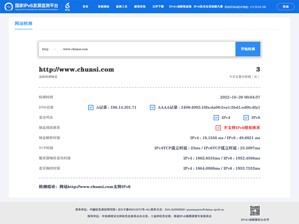接到江西省春絲食品有限公司委托我公司對(duì)春絲食品企業(yè)官網(wǎng)www.chunsi.com進(jìn)行IPv6的升級(jí)改造的需求后,我公司迅速與江西省春絲食品有限公司信息部負(fù)責(zé)人進(jìn)行對(duì)接,并確定了升級(jí)方案。為不影響用戶正常的訪問,我公司技術(shù)人員利用晚上時(shí)間,加班加點(diǎn)對(duì)春絲食品企業(yè)官網(wǎng)進(jìn)行升級(jí)服務(wù)。經(jīng)過樟樹市極速網(wǎng)絡(luò)科技有限公司專業(yè)團(tuán)隊(duì)的加班加點(diǎn)服務(wù),春絲食品企業(yè)官網(wǎng)于2022年10月19日完成升級(jí),升級(jí)改造完成后的春絲食品官網(wǎng),通過國家IPv6發(fā)展監(jiān)測(cè)平臺(tái)https://www.china-ipv6.cn/進(jìn)行在線檢測(cè),檢測(cè)結(jié)論顯示網(wǎng)站http://www.chunsi.com支持IPv6
